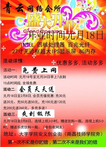 青云网络会所将于1月18日开业,INTEL四核处理器、百兆光纤、27寸无边框超大IPS显示器、8G内存,优惠多多、活动多多。